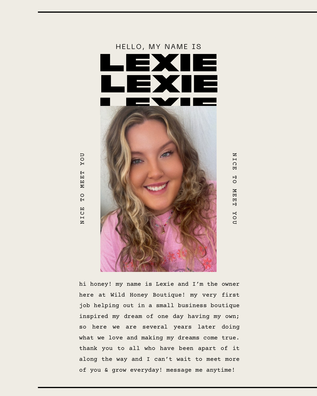 My name is Lexie Epps and I am the owner here at Wild Honey! My very first job helping out in a small business boutique inspired my dream of one day having my own; so here we are several years later doing what we love and making my dreams come true. Thank you to all who have been apart of it along the way and I can't wait to meet more of you & grow everyday.